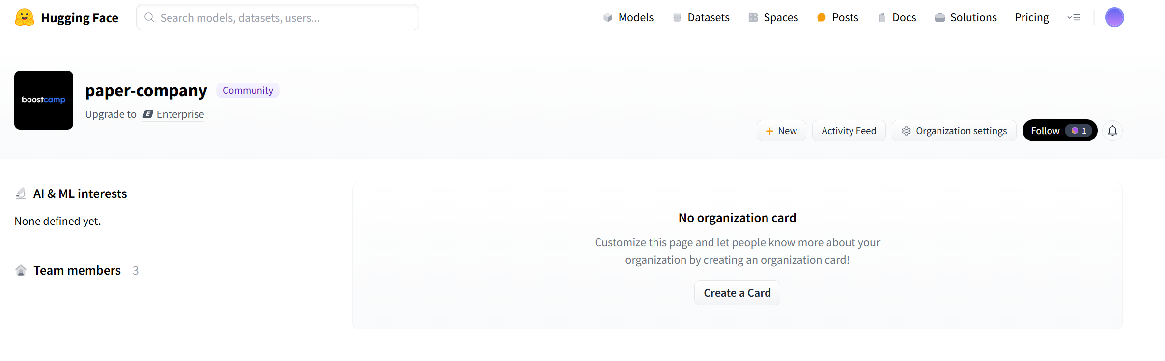 Organization을 만들면, 여러 팀원이 하나의 허깅페이스 계정에서 협업할 수 있게 된다. 팀 단위로 모델과 데이터셋을 관리하여, 모든 멤버가 동일한 리소스에 접근하고 업데이트할 수 있고, 각 멤버에게 관리자, 편집자, 읽기 전용 등의 권한을 부여할 수 있어, 팀 내에서 역할에 맞게 접근 권한을 설정할 수 있다. 그러기 위해서