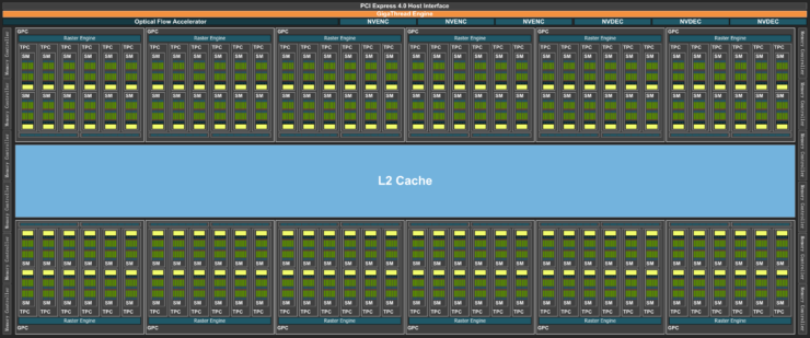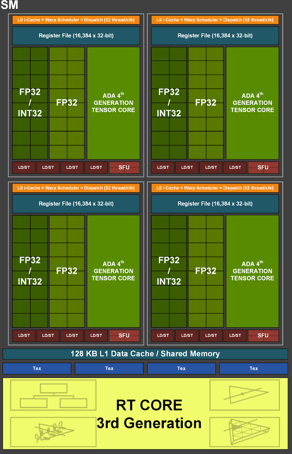 최신 발표된 Nvidia의 AD102 칩셋(RTX4090)의 다이어그램을 보면 코어가 백여개씩 그룹으로 묶여있으며, 각각의 코어 그룹은 백여개의 스레드가 들어있는 개별의 워프를 연산함을 알 수 있습니다.