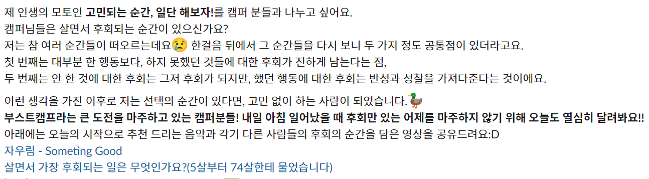 부트캠프를 병행하며 추가적인 자기개발을 지속해야겠다는 생각을 갖고있지만 실천하지 못헀다.